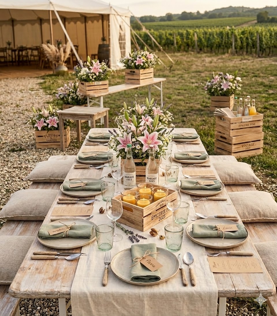 Les tables en bois brut sont particulièrement appréciées pour ce type de réception. Leur aspect naturel s’intègre parfaitement dans une décoration vintage ou bohème. Une table en bois brut peut par exemple être laissée apparente sans nappe afin de valoriser la matière.